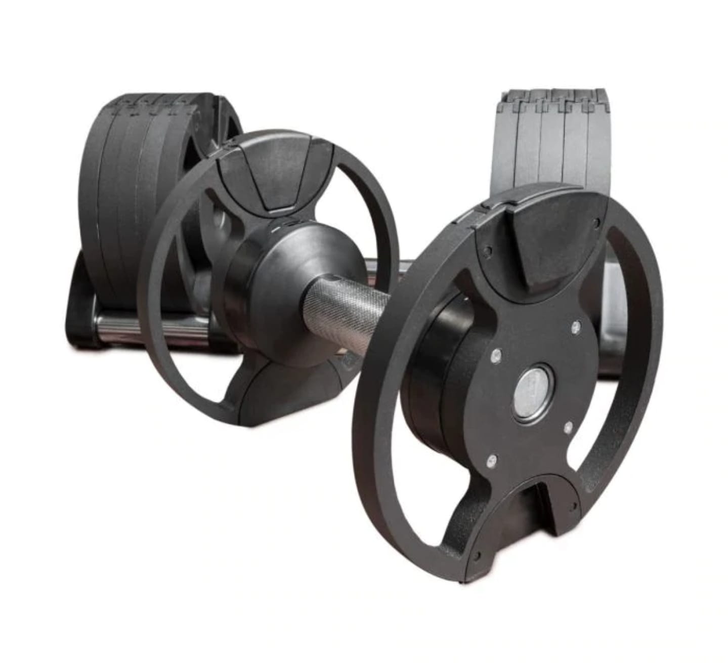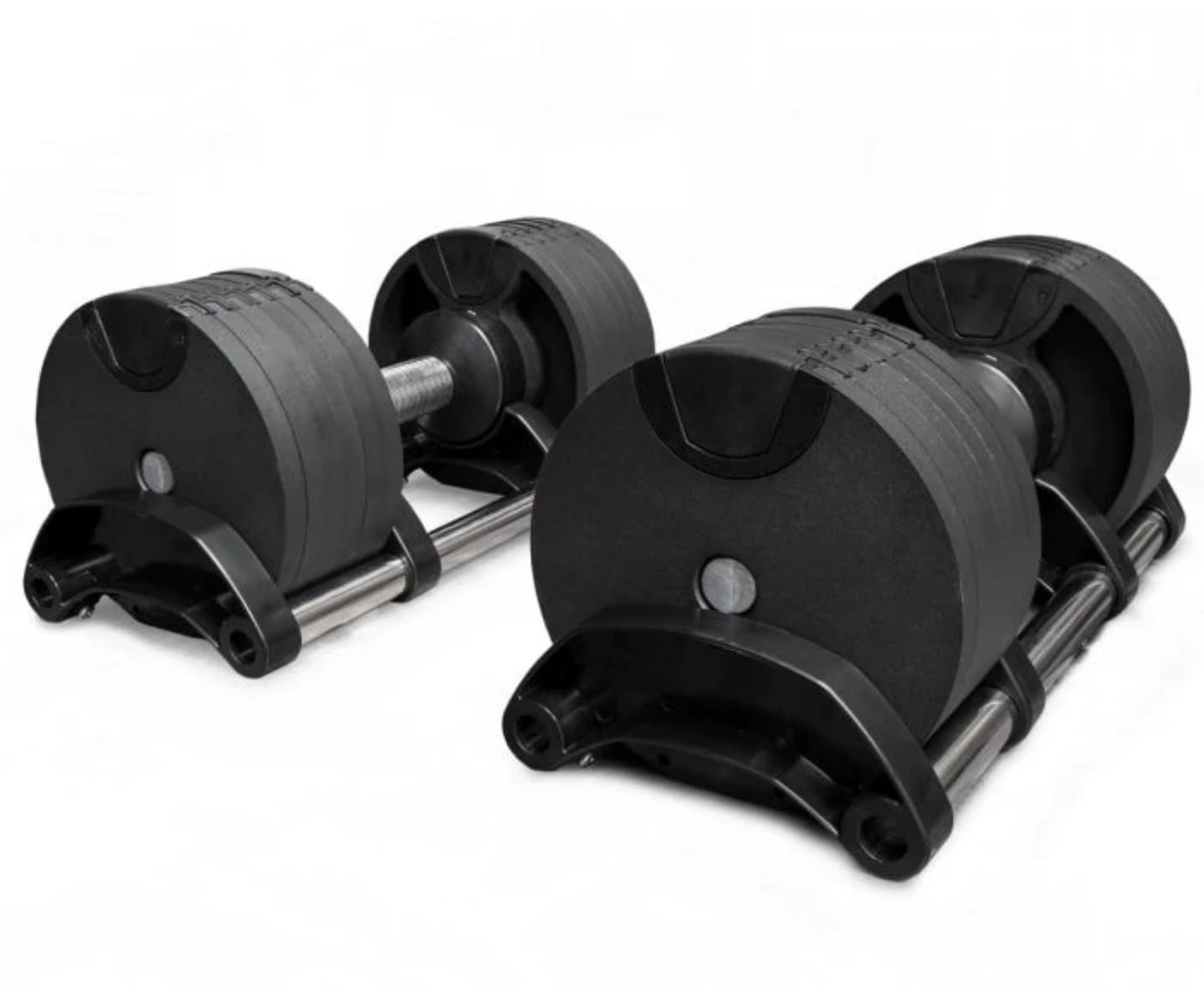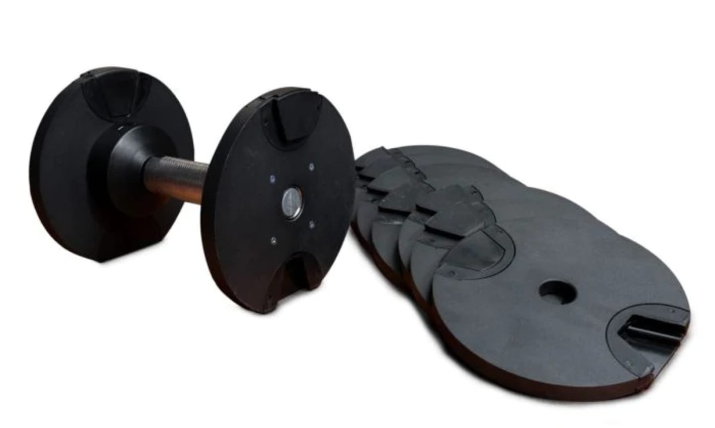 Set de 2 mancuernas ajustables de hasta 20 kg cada una, diseñadas para entrenar con progresión precisa gracias a su sistema de incremento en pasos de 2 kg en 2 kg.